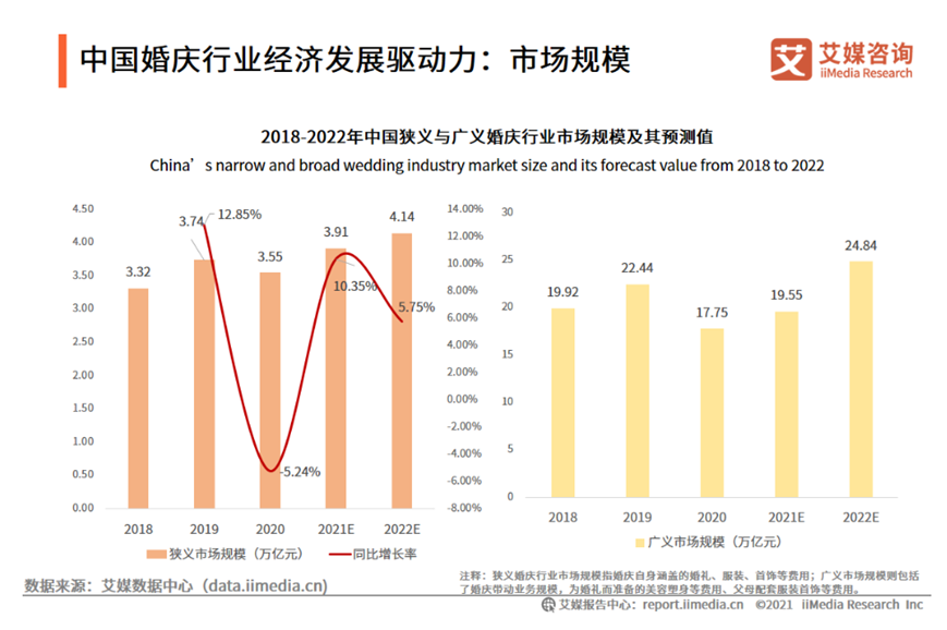 然而,在疫情“黑天鵝”的影響下,國內婚慶市場因其與線下多產業(yè)鏈條強關聯特性暫時遇冷,婚慶行業(yè)市場規(guī)模有小幅度下跌,但隨著疫情常態(tài)化防控,婚慶市場逐漸回暖,消費需求日趨增長,投資前景向好。