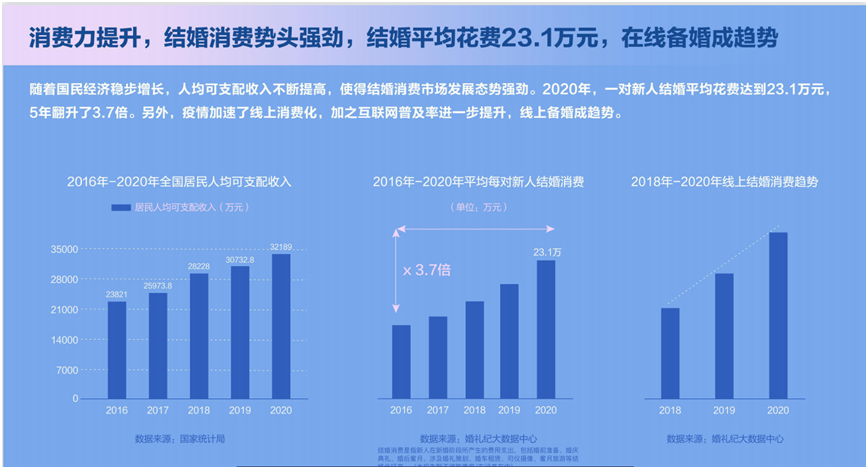 同時,疫情背景下數字技術和應用的不斷普及和優(yōu)化,也給婚慶行業(yè)帶來了新的模式轉型契機,以互聯網婚慶為代表的線上婚禮形態(tài)多元,數字化婚禮趨勢日益清晰。