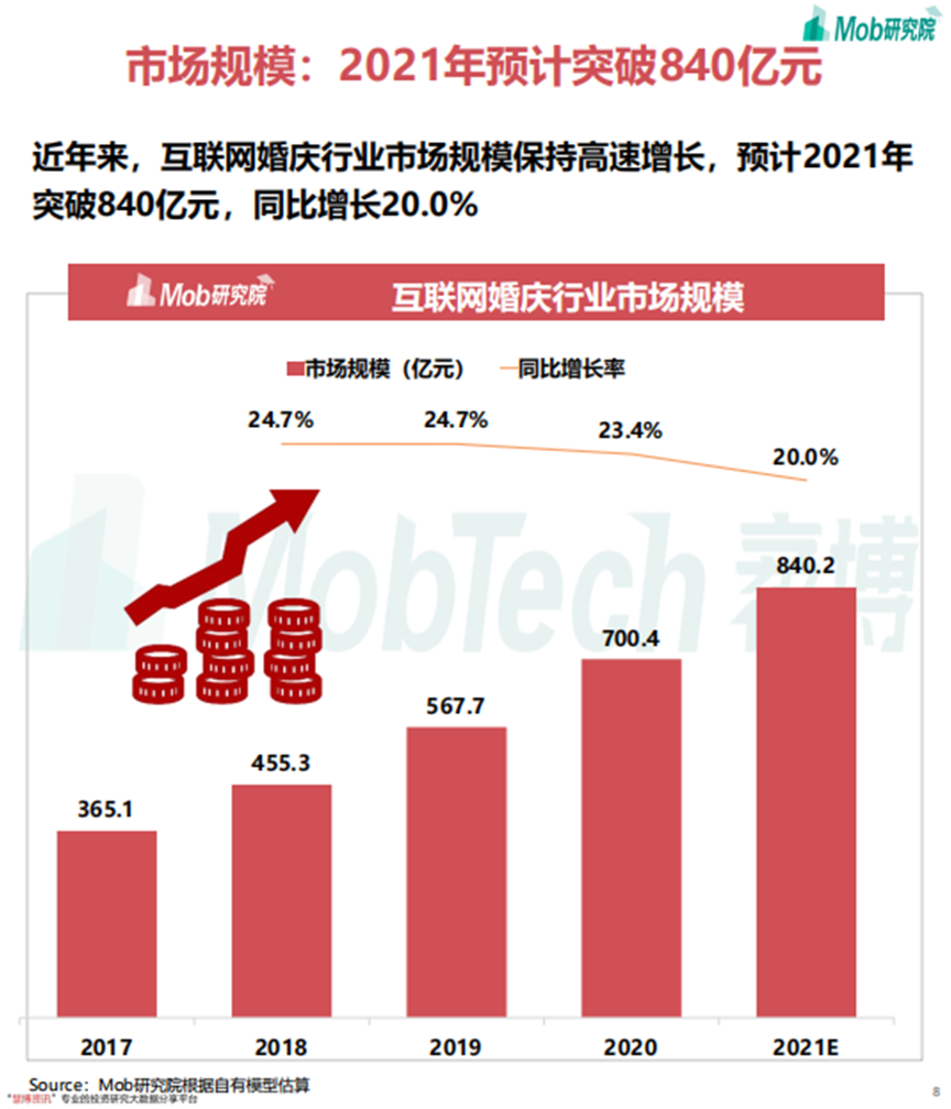 據艾媒咨詢報告分析,目前中國20-40歲的適婚人口總量約為4.47億人,大量的適婚人口,為中國婚慶市場增加了潛在客戶。而隨著居民收入的增加和生活品質的提高,婚慶質量要求逐年上升,形式趨于多樣化,形成了巨大的增量市場。