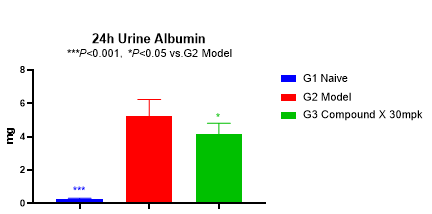 蛋白尿水平常作為臨床研究的替代終點(diǎn)。2021年12月,F(xiàn)DA首次基于蛋白尿下降這一替代臨床終點(diǎn)批準(zhǔn)了IgA腎病新藥TARPEYO(布地奈德)。如圖3所示,模型組大鼠的尿ALB水平和UACR顯著升高。待測(cè)化合物給藥6周后,尿ALB水平和UACR顯著性下降。