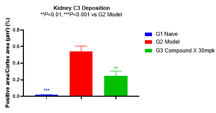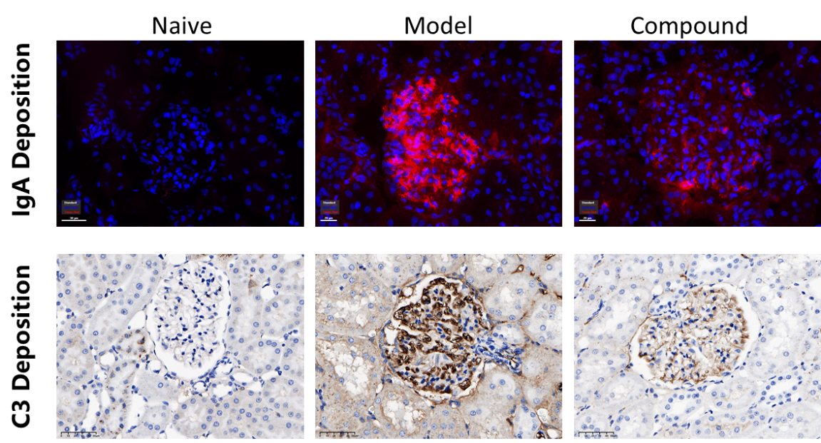 本實(shí)驗(yàn)通過(guò)單側(cè)腎切除術(shù)聯(lián)合BSA/LPS/CCL4誘導(dǎo),成功建立了大鼠IgA腎病動(dòng)物模型。大鼠尿ALB水平和UACR值顯著升高,腎小球IgA和C3沉積水平顯著增加,部分模擬了臨床患者的癥狀,符合患者的臨床表現(xiàn),與文獻(xiàn)報(bào)道基本一致。藥物處理6周后,尿ALB水平和UACR有明顯的下降,腎小球 IgA和C3的沉積水平顯著下降,表明該模型可用于評(píng)估藥物對(duì)于IgA腎病的治療效果。