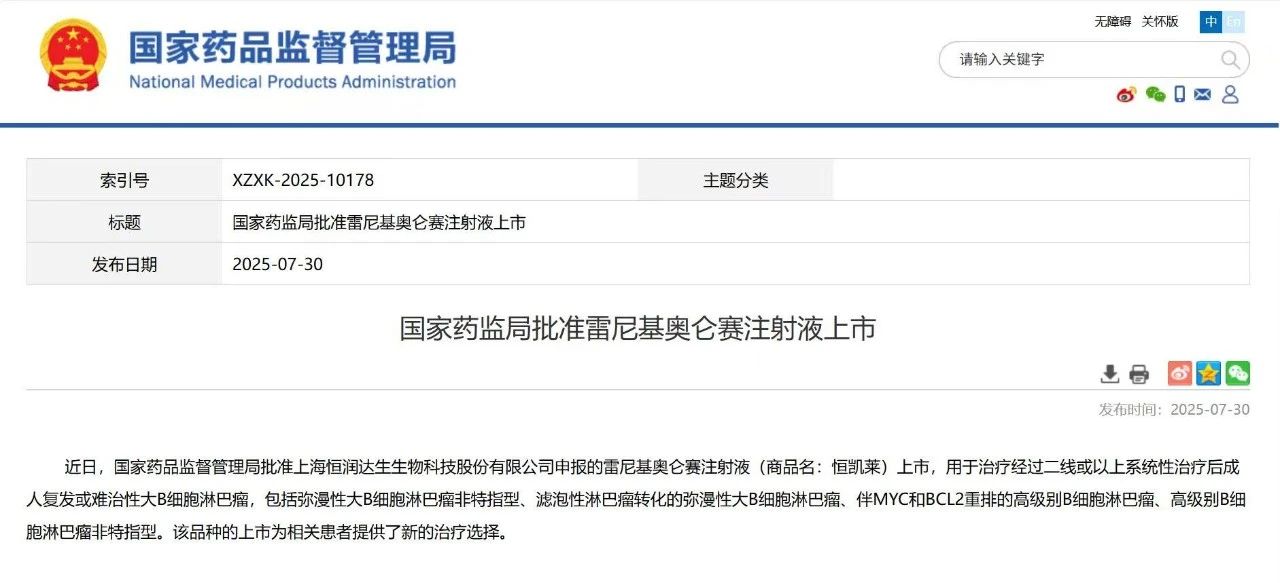 2025年7月30日,上海恒潤(rùn)達(dá)生生物科技股份有限公司(以下簡(jiǎn)稱“恒潤(rùn)達(dá)生”)自主研發(fā)的雷尼基奧侖賽注射液(商品名:恒凱萊?,英文商品名:HICARA?)正式獲得中國(guó)國(guó)家藥品監(jiān)督管理局(NMPA)批準(zhǔn)上市。恒凱萊?是由恒潤(rùn)達(dá)生申報(bào)的1類創(chuàng)新型生物制品,作為我國(guó)首款完全自主研發(fā)的針對(duì)復(fù)發(fā)或難治性大B細(xì)胞淋巴瘤(r/r LBCL)的 CD19 CAR-T 產(chǎn)品,其獲批不僅填補(bǔ)了國(guó)產(chǎn) CAR-T 在該領(lǐng)域的空白,更標(biāo)志著中國(guó)免疫細(xì)胞治療技術(shù)邁入自主可控的全新階段,為更多亟待滿足的臨床需求提供了解決方案。