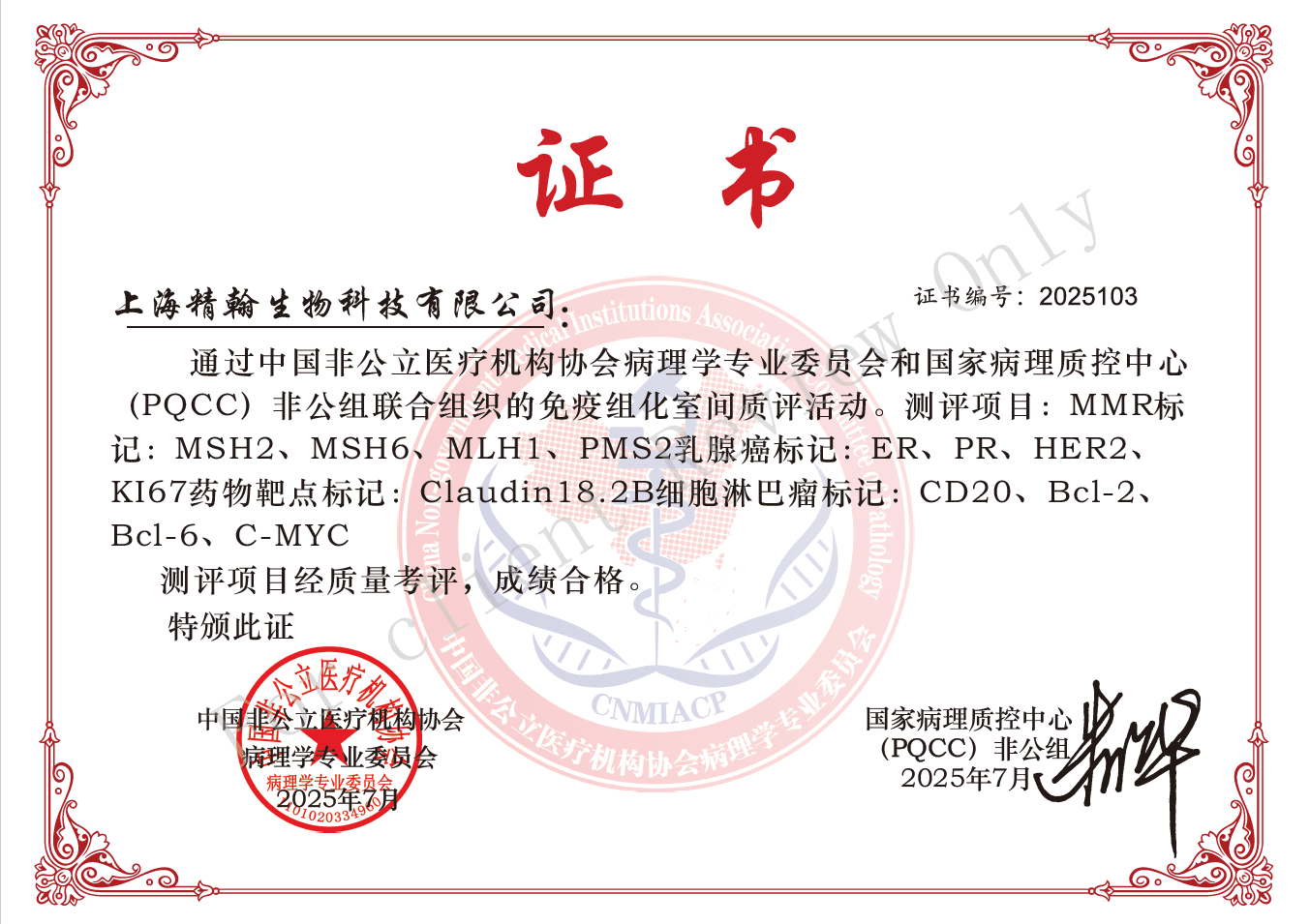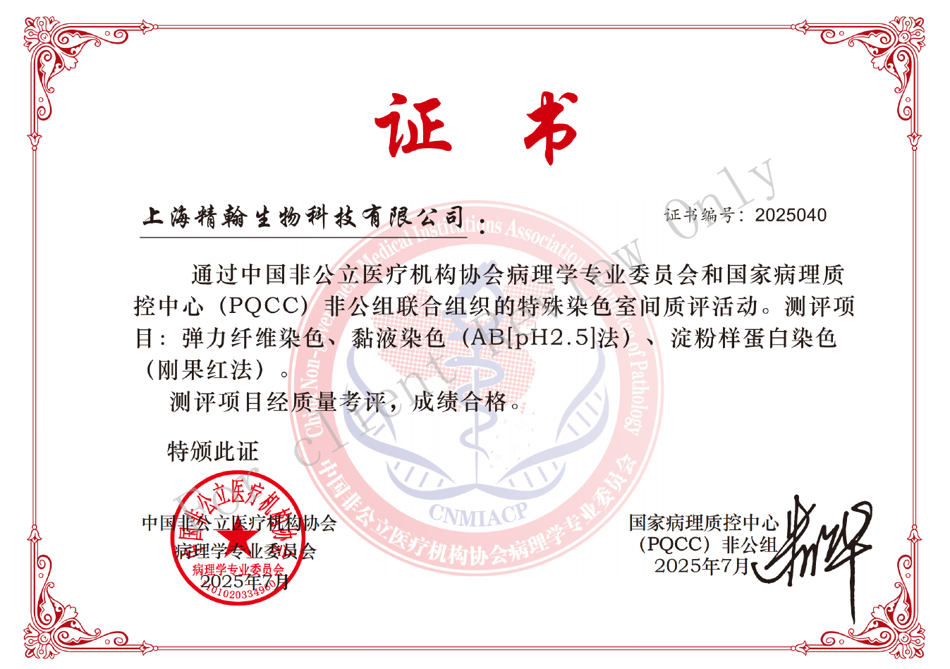 近日,熙寧生物|精翰生物參加中國(guó)非公立醫(yī)療機(jī)構(gòu)協(xié)會(huì)病理學(xué)專業(yè)委員會(huì)和國(guó)家病理質(zhì)控中心(PQCC)非公組聯(lián)合組織的特殊染色室間質(zhì)評(píng)活動(dòng),檢測(cè)指標(biāo)包括MSH2、MSH6、MLH1、PMS2、ER、PR、HER2、KI67、Claudin18.2、CD20、Bcl-2、Bcl-6、C-MYC、彈力纖維染色、粘液染色(AB[Ph2.5]法)、淀粉樣蛋白染色(剛果紅法),以上16項(xiàng)檢測(cè)指標(biāo)熙寧生物|精翰生物組織病理平臺(tái)均高分通過(guò),榮獲合格證書(shū)。