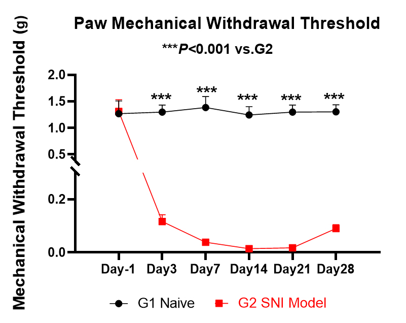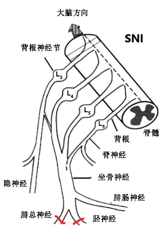 SNI模型是一個(gè)局部去神經(jīng)模型,坐骨神經(jīng)三個(gè)分支中的兩個(gè)(脛神經(jīng)和腓總神經(jīng))從分岔遠(yuǎn)端切斷,而第三個(gè)分支(腓腸神經(jīng))完好無損(圖3)。由于腓腸神經(jīng)保持完整,控制區(qū)域內(nèi)(爪外側(cè)區(qū)域)產(chǎn)生重復(fù)性、持久性均良好的超敏反應(yīng)(異常性疼痛和痛覺過敏)(圖4)。