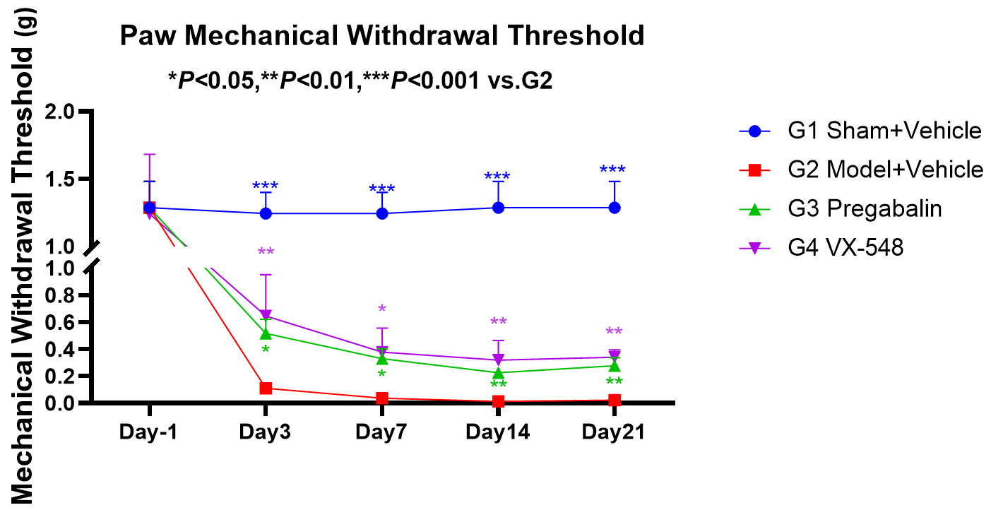 VX-548是一種在研口服選擇性NaV1.8抑制劑,與其它NaV離子通道相比,對(duì)NaV1. 8具有高度選擇性。由于Nav1.8是一種主要表達(dá)于外周傷害感受神經(jīng)元上的河豚毒素不敏感型鈉通道,且不參與中樞神經(jīng)相關(guān)的活動(dòng),所有VX-548不會(huì)存在類似阿片類藥物的成癮性問題,也不會(huì)對(duì)運(yùn)動(dòng)功能產(chǎn)生影響。VX-548已經(jīng)獲得了美國(guó)FDA的快速通道資格和突破性療法認(rèn)可,適用于治療中度到重度的急性疼痛。