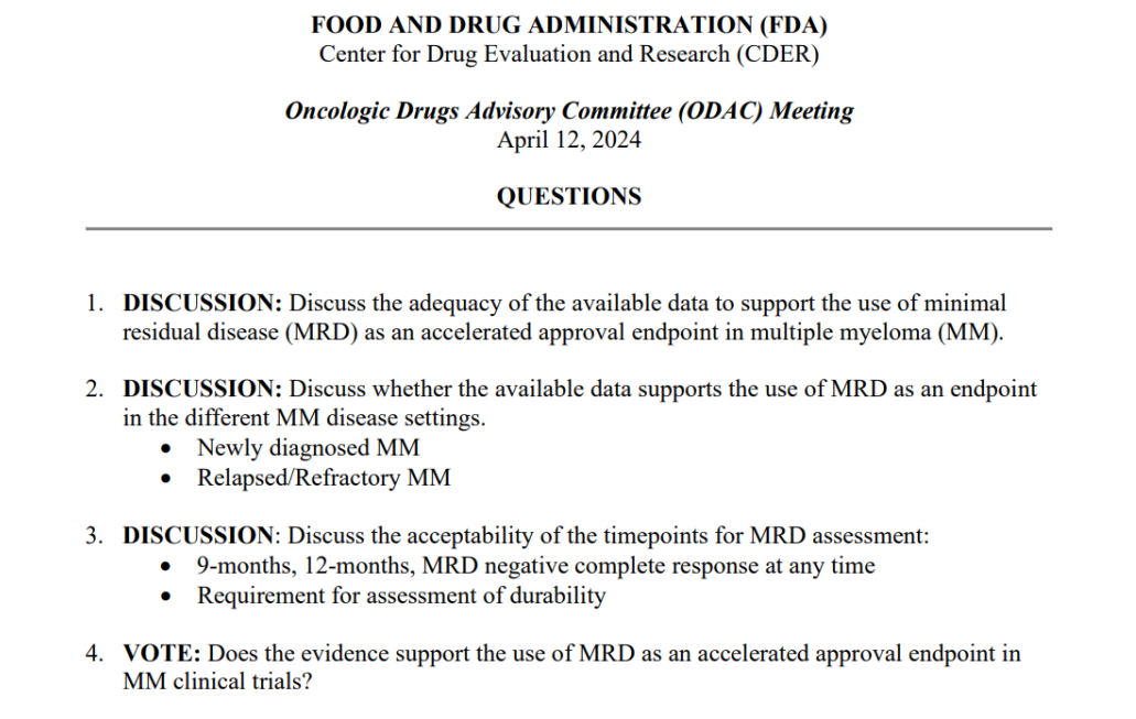 美國時間4月12日,F(xiàn)DA ODAC會議上通過了一項將微小殘留?。╩inimal residual disease,MRD)作為多發(fā)性骨髓瘤(multiple myeloma,MM)加速批準終點的議題。