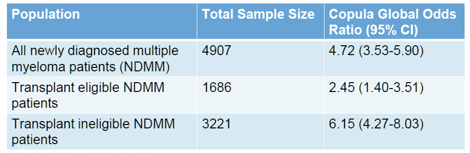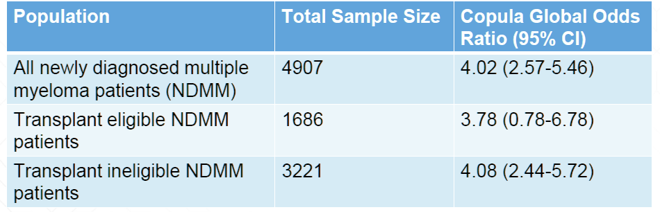 個體患者水平:在所有NDMM人群中,Copula Global Odds Ratio (4.72)顯示12個月MRD陰性與PFS之間存在強烈的個體水平關聯(lián);也就是說,在12個月時MRD為陰性是更好的長期獲益的預后。同樣的,在所有NDMM人群中,Copula Global Odds Ratio (4.02)顯示12個月MRD陰性與OS之間存在強烈的個體水平關聯(lián);也就是說,12個月的MRD陰性是更好的長期OS的預后。在適合移植和不適合移植的亞組中觀察到類似的結果。