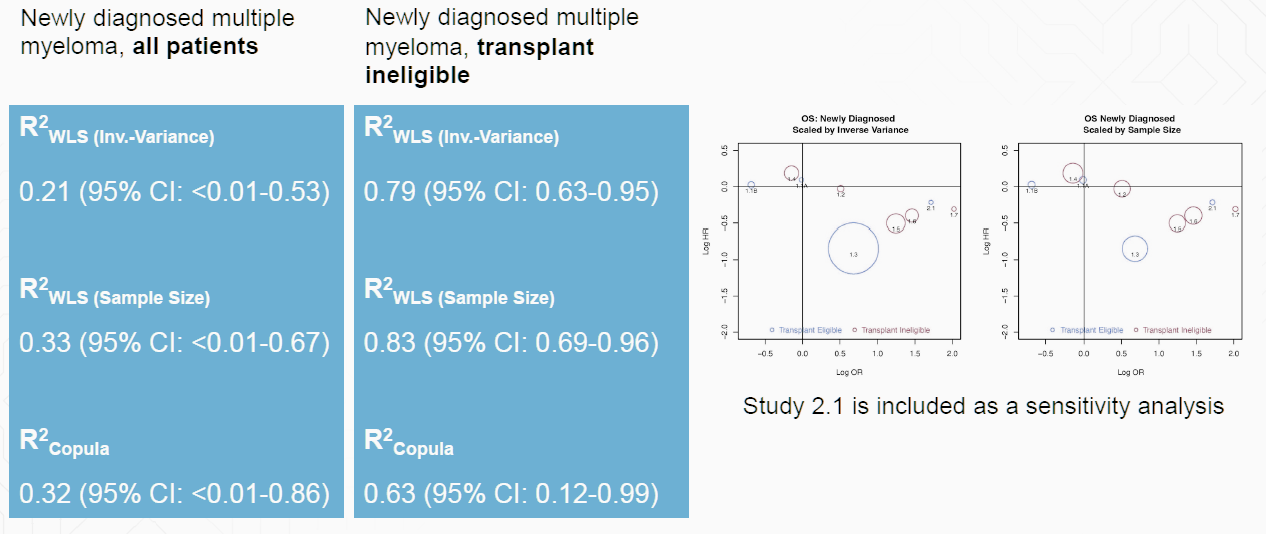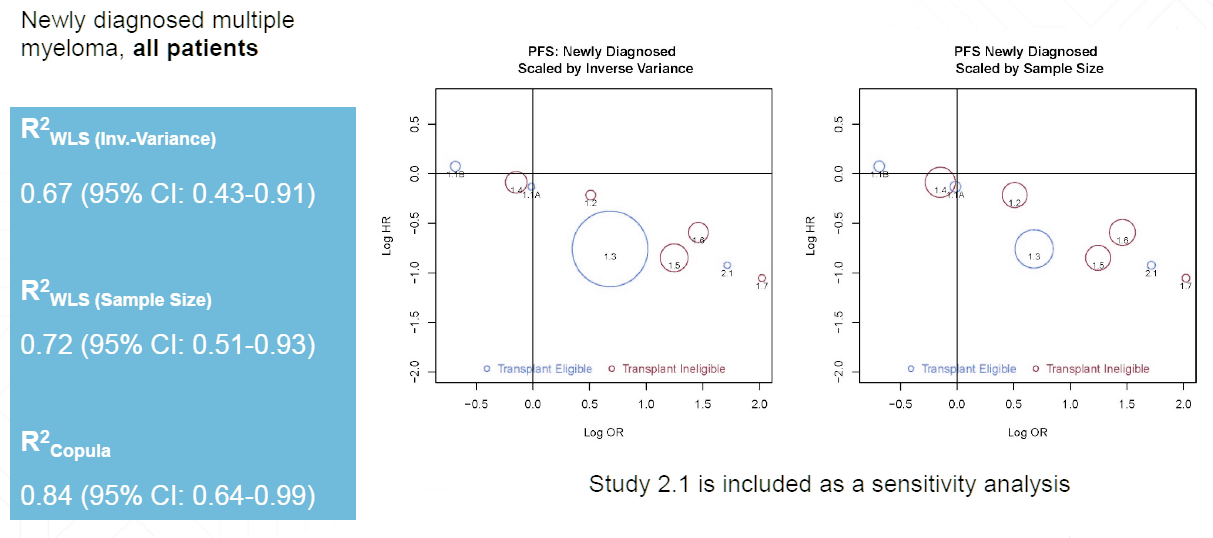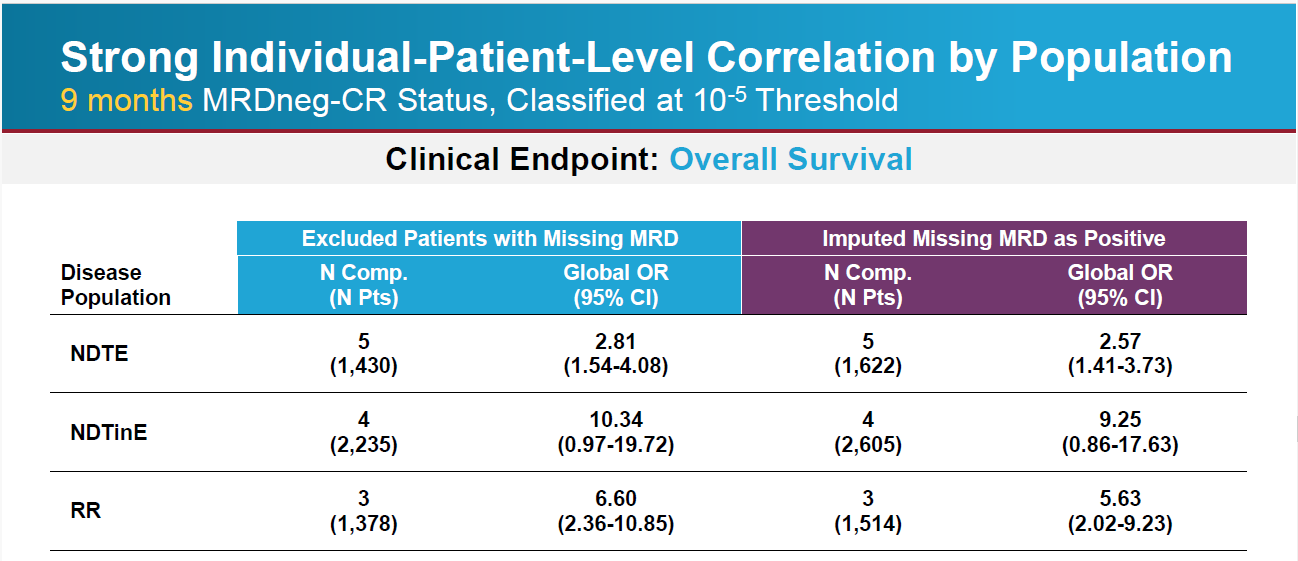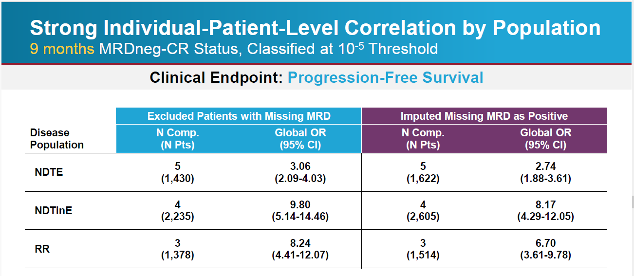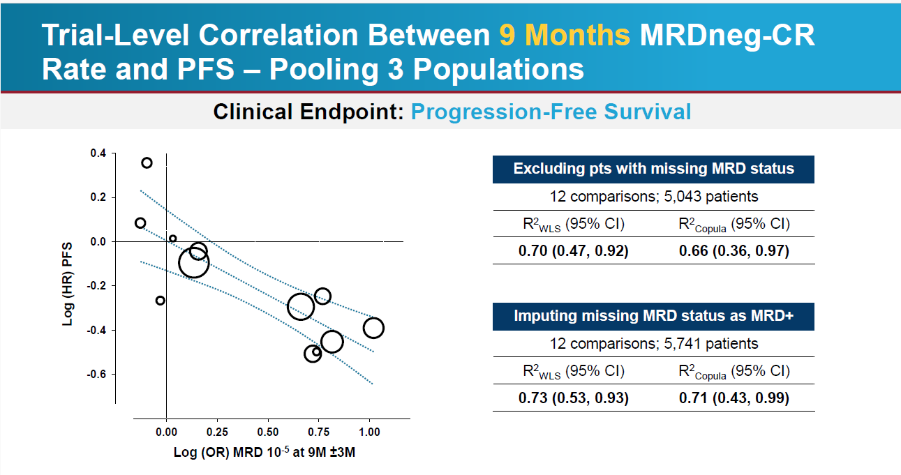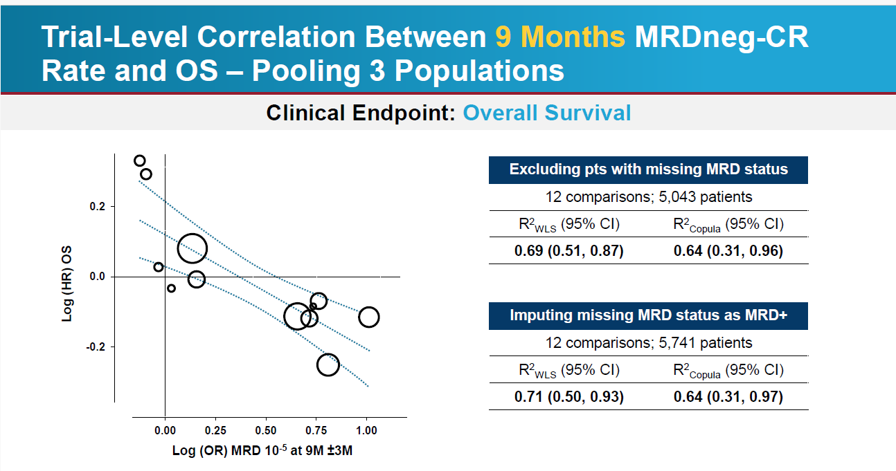 在試驗水平上,9個月MRD陰性率顯示出與PFS的中等強度相關性,與OS同樣為中等強度相關。