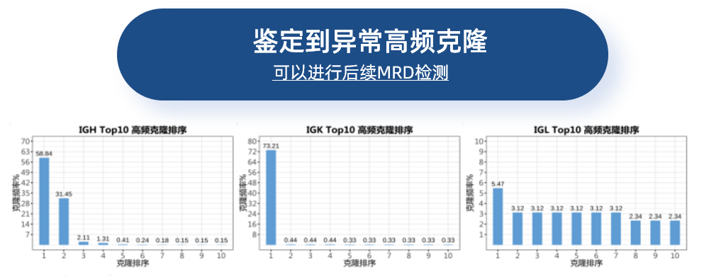 NGS平臺MRD檢測基于準確靈敏的多重PCR方法擴增 TCR/Ig 的受體鏈(包括IGH、IGK、IGL、TRB、TRD、TRG),對擴增產物進行高通量測序,通過專業(yè)的生物信息學分析檢測B/T細胞受體基因的克隆性重排,鑒定腫瘤相關克隆,并通過MRD檢測跟蹤定量患者治療后的微小殘留腫瘤細胞數(shù)量。