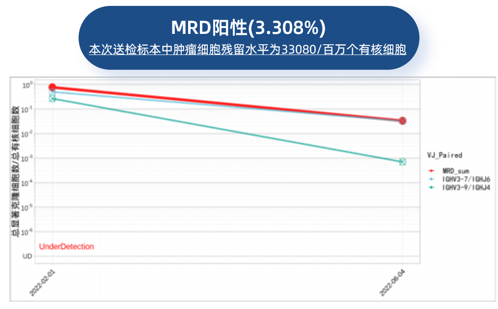 由圖可知,送檢標本中檢測到腫瘤殘留的克隆,殘留水平為100萬個有核細胞中有33080個腫瘤細胞,為臨床診斷及腫瘤復發(fā)評估提供指導意義。