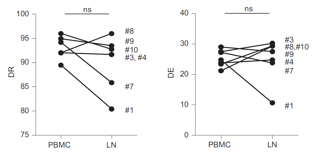 圖2 淋巴結(jié)(LN)轉(zhuǎn)移瘤的多樣性可能為臨床結(jié)果提供有用信息[3]。通過ImmunTraCkeR?評估黑色素瘤患者血液和淋巴結(jié)轉(zhuǎn)移瘤中TCR庫的多樣性(計算多樣性豐富度和均勻度)。血液和淋巴結(jié)DR值(左圖)和DE值(右圖)的對比