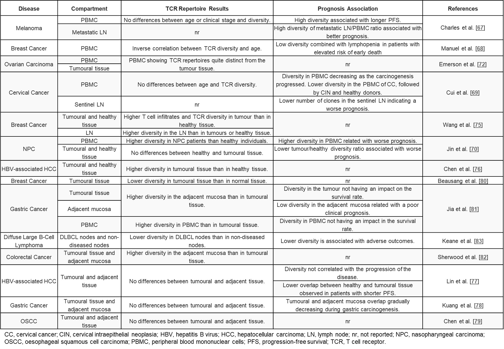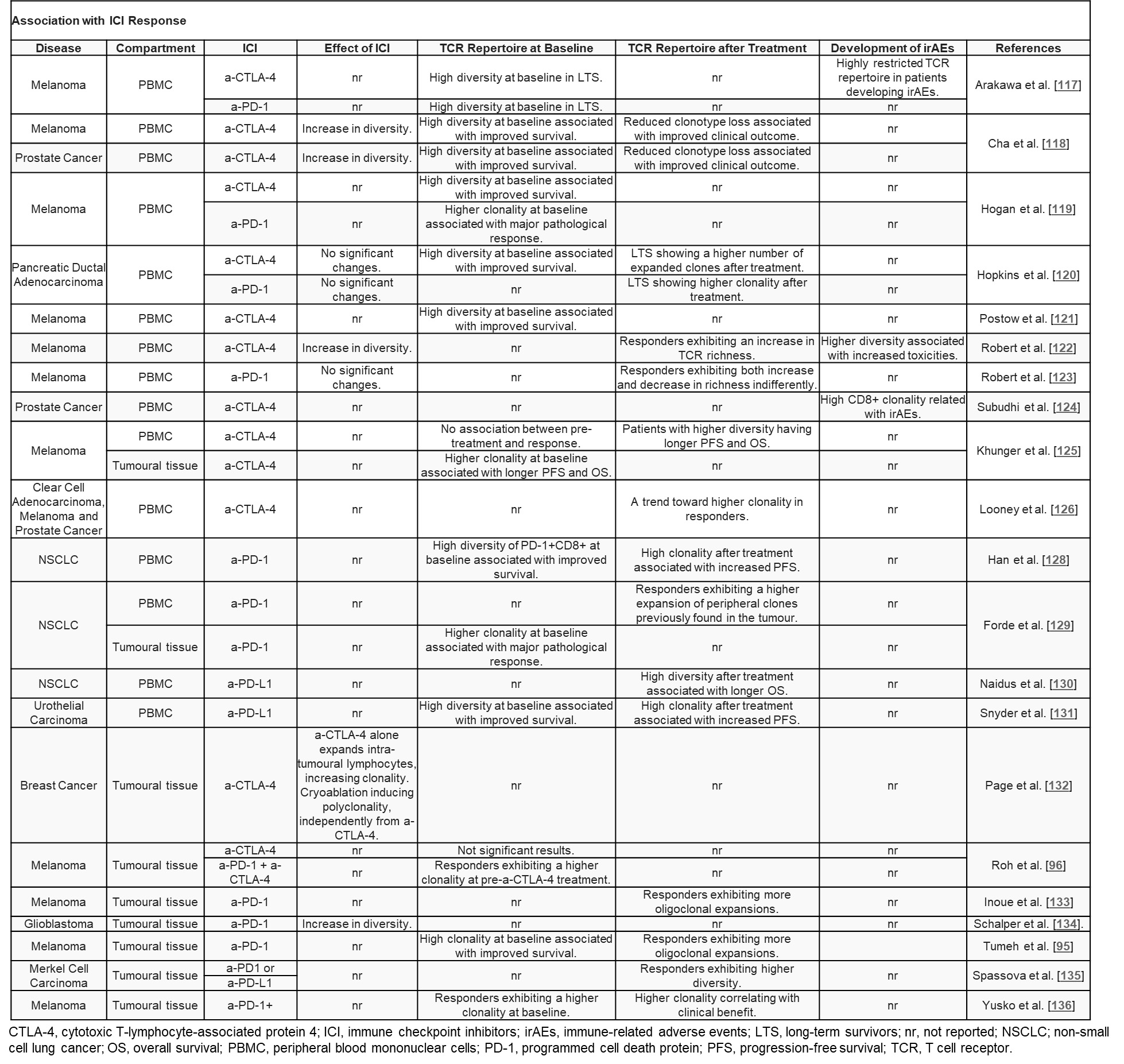 [1] Aran A, Garrigós L, Curigliano G, Cortés J, Martí M. Evaluation of the TCR Repertoire as a Predictive and Prognostic Biomarker in Cancer: Diversity or Clonality? Cancers (Basel). 2022 Mar 31;14(7):1771. doi: 10.3390/cancers14071771. PMID: 35406543; PMCID: PMC8996954.