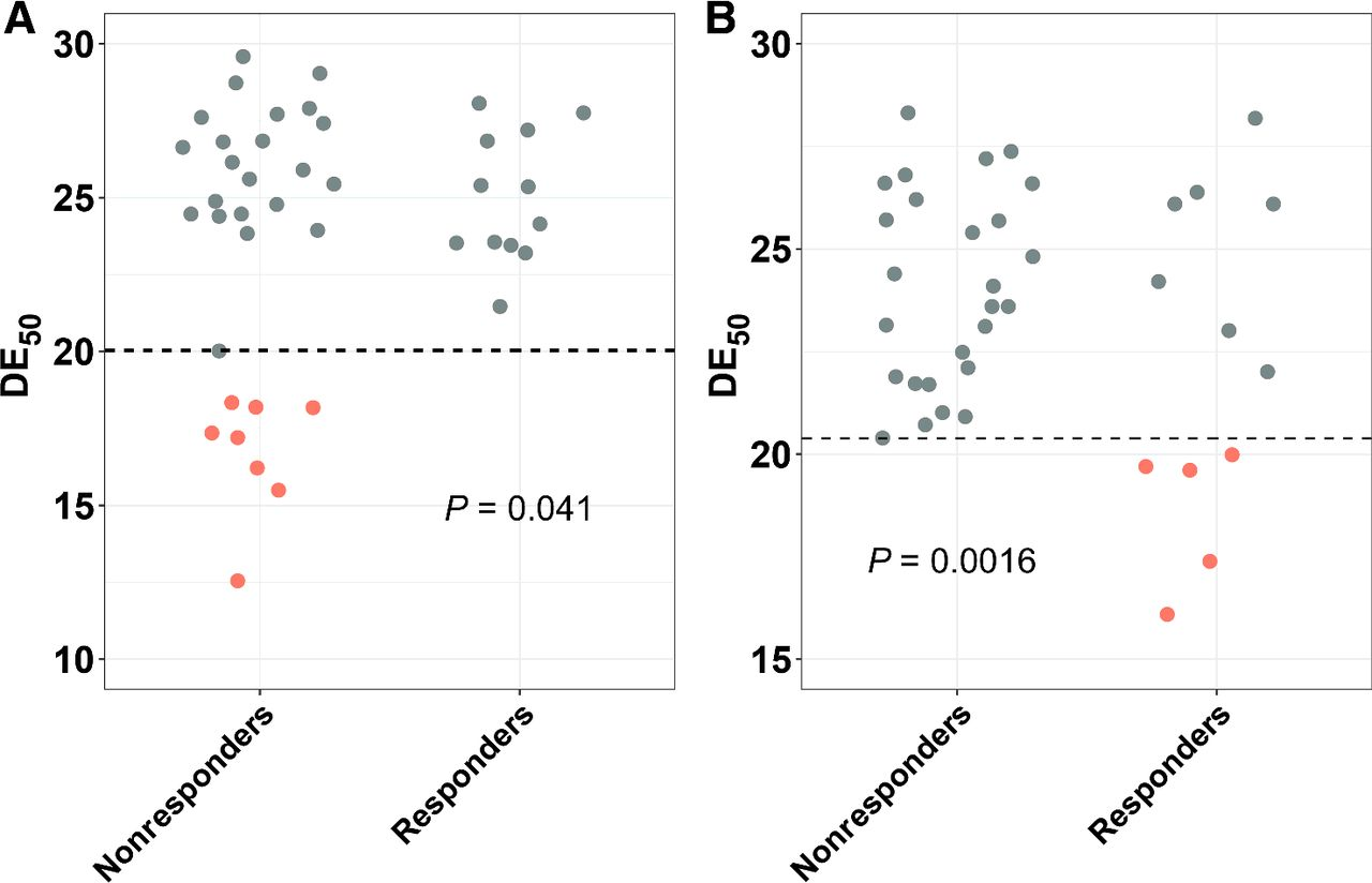 圖6 治療前TCR多樣性的均勻度[8]。A,散點圖顯示對anti-CTLA-4治療有反應或無反應患者的基線DE50。N = 42。虛線,20.03%。B,散點圖顯示對anti-PD-1治療有反應或無反應患者的基線DE50水平。N = 38。虛線,20.4%。用Fisher精確檢驗計算P值