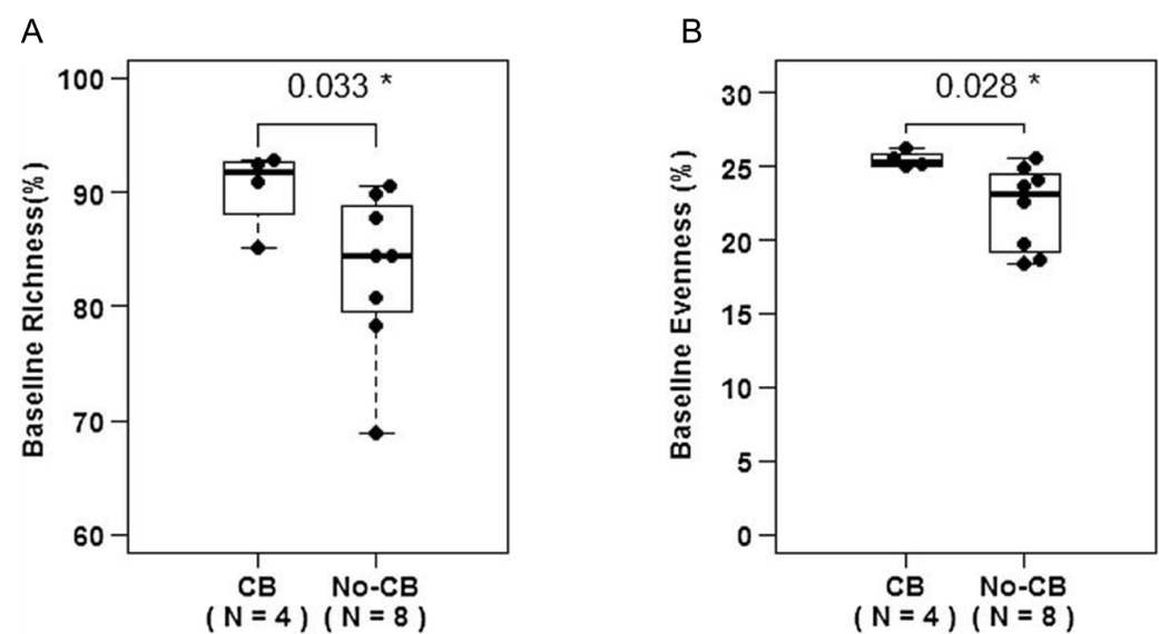 圖3 A,有臨床獲益的患者在基線時TCR庫的豐富度更高(p = 0.033);B,有臨床獲益的患者在基線時TCR庫的均勻度更高(p = 0.028)[5]