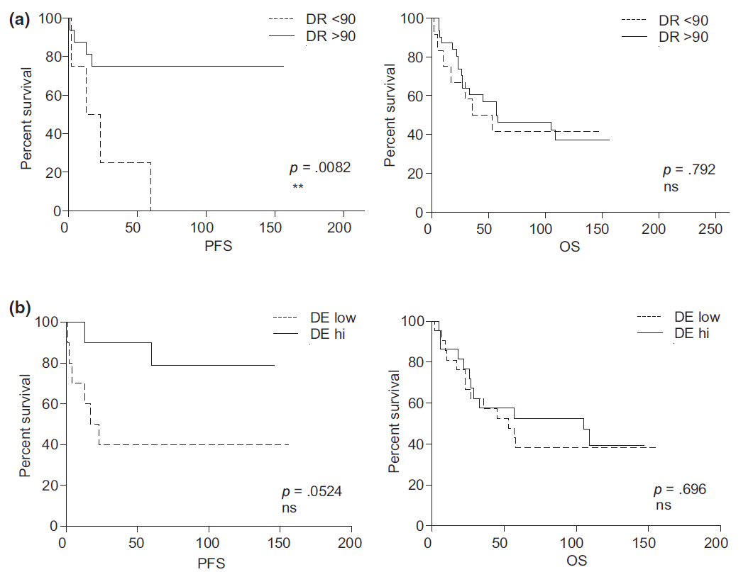 圖1 DR和DE參數(shù)的數(shù)值高預示更長的PFS[3]。通過ImmunTraCkeR?評估黑色素瘤患者血液中TCR庫的多樣性,并評估其對臨床結(jié)果的影響: (a) 低DR值 (<90%, n="12)和高DR值">90%, n = 32)患者的PFS (左圖)和OS (右圖)對比; (b) DE值低于或高于中位數(shù)的患者的PFS (左圖)和OS (右圖)的對比(n = 44)。采用log-rank檢驗進行分析