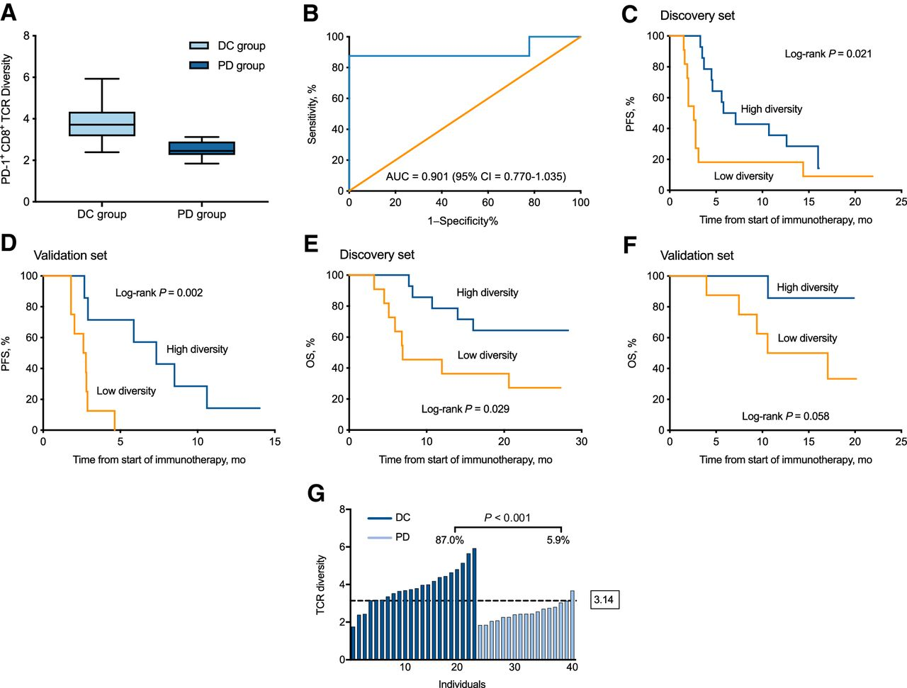 圖5 TCR庫多樣性與PD-1或PD-L1抑制劑治療的反應和PFS的相關(guān)性[7]。A,隊列A中PD-1/PD- l1抑制劑治療后DC和PD亞組PD-1+ CD8+ TCR多樣性的比較(n = 25)。B,使用ROC曲線隊列A中區(qū)分PD患者和DC患者(n = 25)。C,隊列A的PFS通過PD-1+ CD8+ TCR庫多樣性進行分層(n = 25)。D,隊列B的PFS通過PD-1+ CD8+ TCR多樣性進行分層 (n = 15)。E,隊列A的OS通過PD-1+ CD8+ TCR庫多樣性進行分層 (n = 25)。F,隊列B的OS通過PD-1+ CD8+ TCR庫多樣性進行分層(n = 15)。G, TCR多樣性對判斷PD-1或PD- L1抑制劑的臨床反應(DC vs PD)的敏感性和特異性(n = 40;DC, n = 23, PD, n = 17)