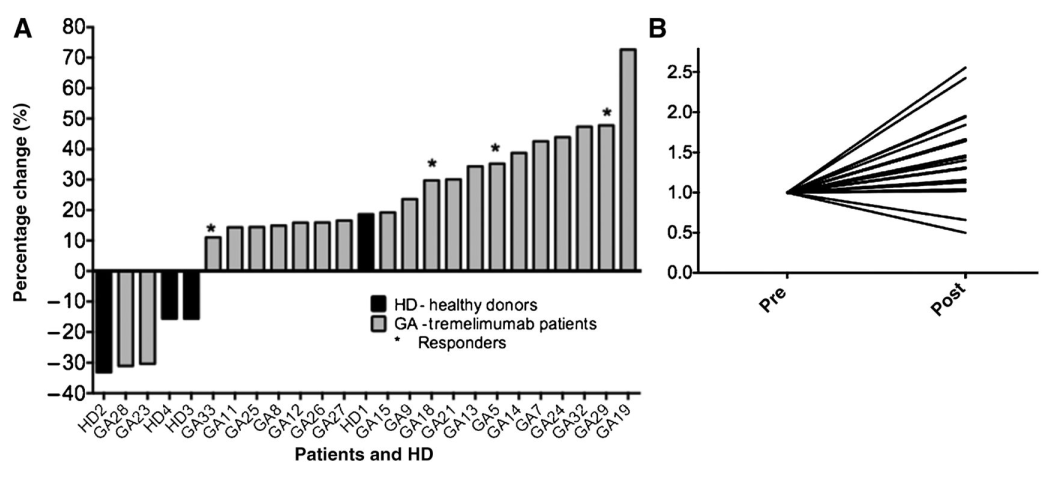 圖4 Unique productive sequences絕對數(shù)值的變化[6]。A,來自21名黑色素瘤患者(GA,黑色)和4名健康人 (HD,灰色)的基線和tremelimumab治療后樣本之間的變化。B,標準化的TCR V-beta CDR3庫多樣性。分析比較PBMC樣本的基線和tremelimumab治療后CDR3庫的變化,這些數(shù)值進行歸一化,以可比性的方式顯示治療后的增加和減少