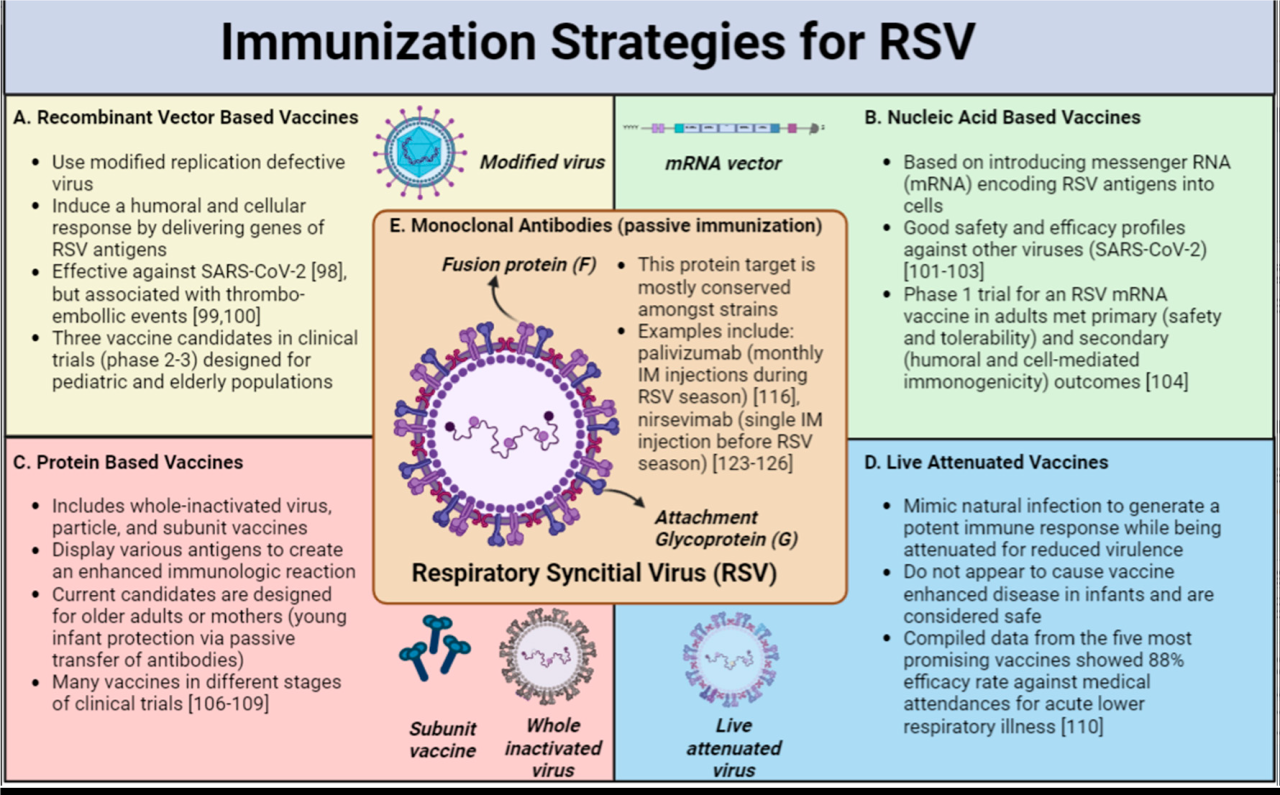 RSV疫苗的開發(fā)始于1957年首次在人類中發(fā)現(xiàn)RSV病毒后不久。1960年代便開發(fā)了FI-RSV疫苗,并在嬰兒身上進(jìn)行了臨床試驗(yàn)。疫苗病毒通過細(xì)胞培養(yǎng)產(chǎn)生,用福爾馬林滅活,并與明礬混合作為佐劑。然而,F(xiàn)I-RSV主要表達(dá)Post-F構(gòu)象而非Pre-F構(gòu)象,該疫苗不僅未能保護(hù)血清陰性的嬰兒免受RSV的侵害,還誘發(fā)嚴(yán)重的增強(qiáng)型呼吸道疾病(Enhanced Respiratory Disease,ERD),導(dǎo)致80%的受試嬰兒住院治療,并導(dǎo)致2人死亡。ERD的部分原因?yàn)楦栺R林導(dǎo)致疫苗制劑中和表位的破壞,F(xiàn)I-RSV注射可導(dǎo)致免疫紊亂,表現(xiàn)為CD4+T細(xì)胞數(shù)量和Th2細(xì)胞因子水平增加,同時(shí),CD8+T細(xì)胞數(shù)量和Th1細(xì)胞因子水平降低,可能也有助于ERD。因此,在血清陰性兒童中開發(fā)滅活疫苗和蛋白質(zhì)疫苗時(shí),必須考慮ERD發(fā)展的潛在風(fēng)險(xiǎn)?;诖擞绊懀琑SV疫苗的開發(fā)推遲了幾十年,目前有五種類型的RSV疫苗正在開發(fā)中,即基于顆粒的、基于載體的、減毒活疫苗或嵌合疫苗、亞單位疫苗和mRNA疫苗。
