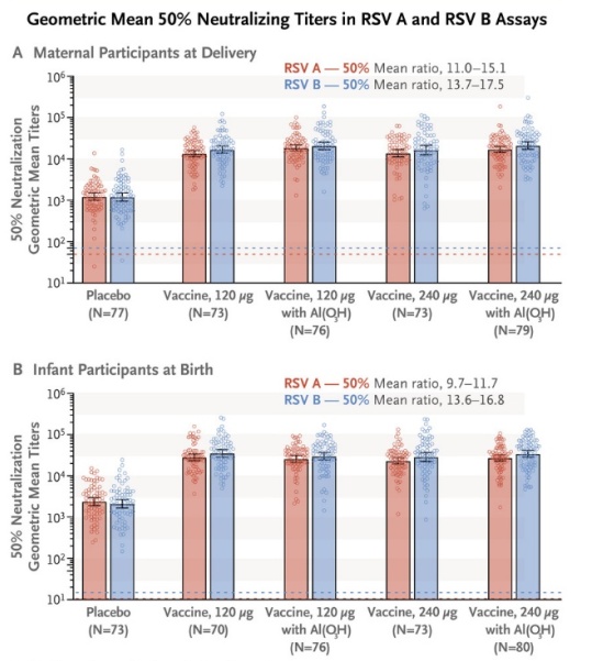 圖4 Abrysvo疫苗母體和嬰兒血清中RSV-A、RSV-B中和抗體滴度檢測(cè)[4]