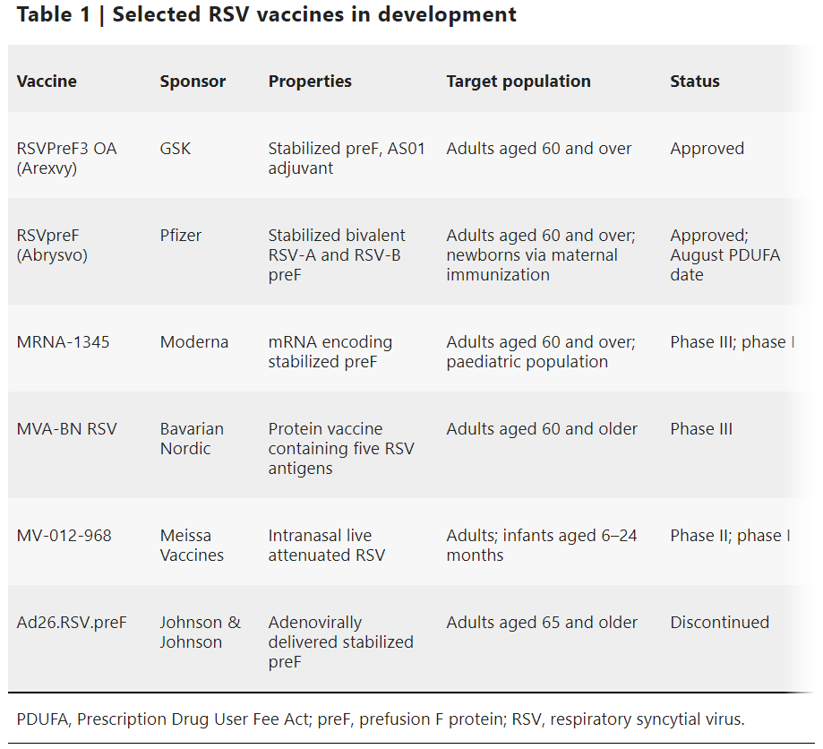 研發(fā)有效的RSV疫苗成為預(yù)防RSV感染的重要手段之一,此前數(shù)十年間,科學(xué)家們不曾停止對(duì)于RSV疫苗的研究與開發(fā),但均以失敗告終。2023年,F(xiàn)DA相繼批準(zhǔn)了葛蘭素史克(GSK)的Arexvy和輝瑞(Pfizer)的Abrysvo兩款RSV疫苗,用于預(yù)防60歲及以上人群中由呼吸道合胞病毒(RSV)引起的下呼吸道疾病,實(shí)現(xiàn)了RSV疫苗和藥物開發(fā)領(lǐng)域近60年來里程碑式的突破。
