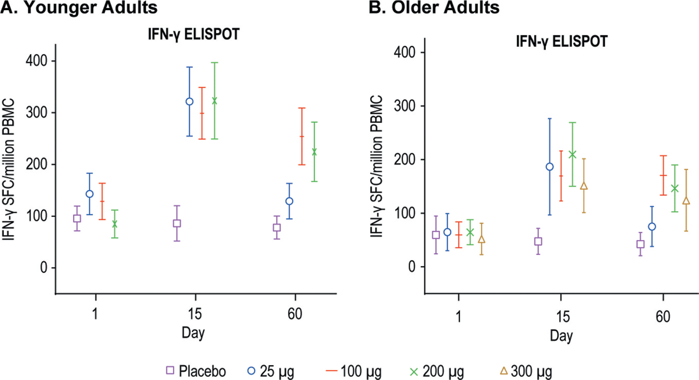 圖6 mRNA-1777 (V171)疫苗特異性T細(xì)胞反應(yīng)(IFN-γ ELISPOT檢測(cè),A 年輕人,B老年人)[5]