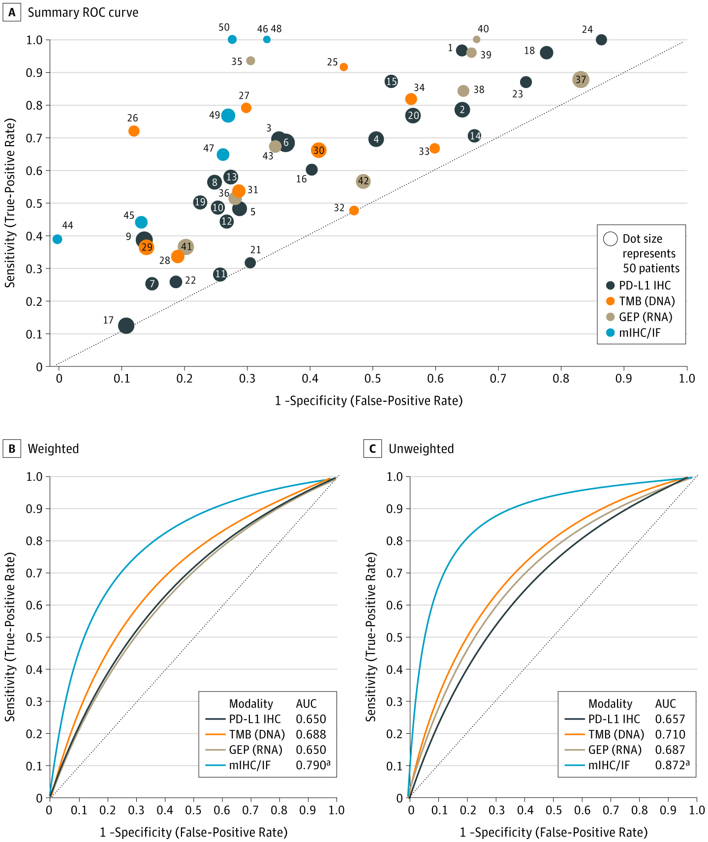此外,mIHC/mIF在預(yù)測ICIs治療效果方面可能具有更高的準(zhǔn)確性。Lu等人薈萃分析了來自50多個研究的抗PD-1/PD-L1治療數(shù)據(jù),涵蓋10多種腫瘤類型和8000多名患者,使用ROC和AUC來檢驗多種生物標(biāo)志物,如PD-L1 IHC、腫瘤負荷(TMB)、基因表達譜(GEP)和mIHC/mIF在預(yù)測PD-1/PD-L1抑制劑療效方面的準(zhǔn)確性。結(jié)果顯示,與其他三種檢測類型相比,mIHC/mIF檢測的預(yù)測準(zhǔn)確性最高(圖1)[4]。