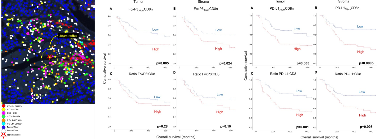 圖2 FoxP3+ T細胞、PD-L1+ T細胞與CD8+ T細胞的距離對預(yù)后的影響[6]