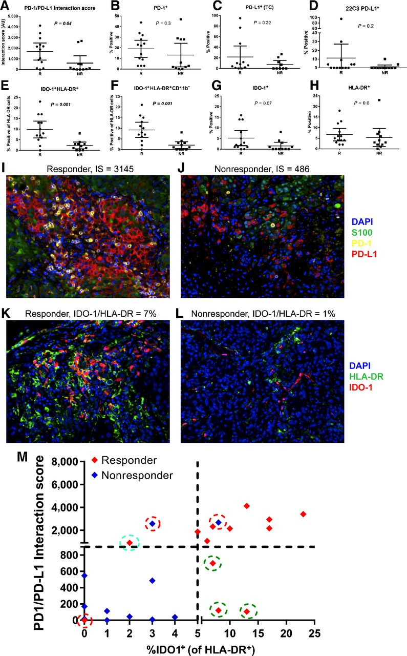 Johnson等[7]對來自10個腫瘤研究中心166名黑色素瘤患者(發(fā)現(xiàn)隊列,n = 24; 驗證隊列,n = 142)在接受抗PD-1治療前的腫瘤活檢組織進行多重?zé)晒馊旧?,選定的生物標(biāo)志物特征、PD-1/PD-L1相互作用評分和IDO-1/HLA-DR共表達被用來評估抗PD-1治療的結(jié)果。研究表明,發(fā)現(xiàn)隊列中PD-1/PD-L1相互作用評分和/或IDO-1/HLA-DR共表達與抗PD-1治療反應(yīng)密切相關(guān)(P = 0.0005)。相比之下,單獨的生物標(biāo)志物(PD-1, PD-L1, IDO-1, HLA-DR)與治療反應(yīng)或生存無關(guān)。這一發(fā)現(xiàn)驗證隊列中得到了重復(fù):PD-1/PD-L1和/或IDO-1/HLA-DR相互作用高的患者更有可能產(chǎn)生反應(yīng)(P = 0.0096),這些患者的無進展生存期(HR = 0.36;P = 0.0004)和總生存率(HR = 0.39; P = 0.0011)也得到顯著改善。在所有患者中,80% PD-1/PD-L1和IDO-1/HLA-DR相互作用水平較高的患者對PD-1抑制劑有響應(yīng)(P = 0.000004)。相比之下,PD-L1的表達并不能預(yù)測生存率。