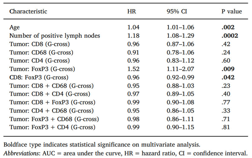 Barua等人[5]利用mIHC方法對120例I-III期非小細胞肺癌患者的腫瘤標(biāo)本進行分析,探討腫瘤微環(huán)境中肺癌細胞與特異性免疫細胞空間接近程度對預(yù)后的影響。該研究對CD8、CD4、Foxp3和CD68進行標(biāo)記,然后利用一種新的G-cross空間距離分布方法分析每種細胞類型的豐度和空間位置以及它們彼此之間的接近程度,采用Cox比例風(fēng)險多元回歸分析淋巴細胞類型接近程度的影響。結(jié)果顯示(表1),腫瘤細胞與Foxp3+ Treg細胞相互作用的G-cross函數(shù)的曲線下面積(AUC)越大,經(jīng)年齡和陽性淋巴結(jié)數(shù)調(diào)整后的生存率越差(HR 1.52 (1.11-2.07), P = 0.009),表明在非小細胞肺癌中,核心腫瘤區(qū)域浸潤Treg細胞的增加是總生存率較差的獨立預(yù)測因子。然而,Treg-CD8的G-cross AUC越大,經(jīng)年齡和陽性淋巴結(jié)數(shù)調(diào)整后的生存率越高(HR 0.96 (0.92-0.99),P = 0.042),說明Treg細胞中CD8+毒性T細胞浸潤的增加能夠減輕這種效應(yīng),并與更好的生存率顯著相關(guān)。