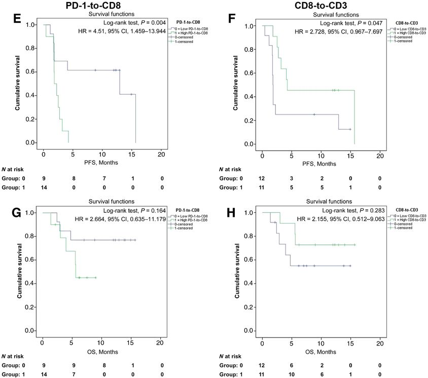 圖4 Kaplan-Meier曲線顯示PD-1-to-CD8 (D, F)和CD8-to-CD3 (E, G)分別對免疫治療晚期NSCLC患者DFS (D, E)和OS (F, G)的預(yù)測作用[8]