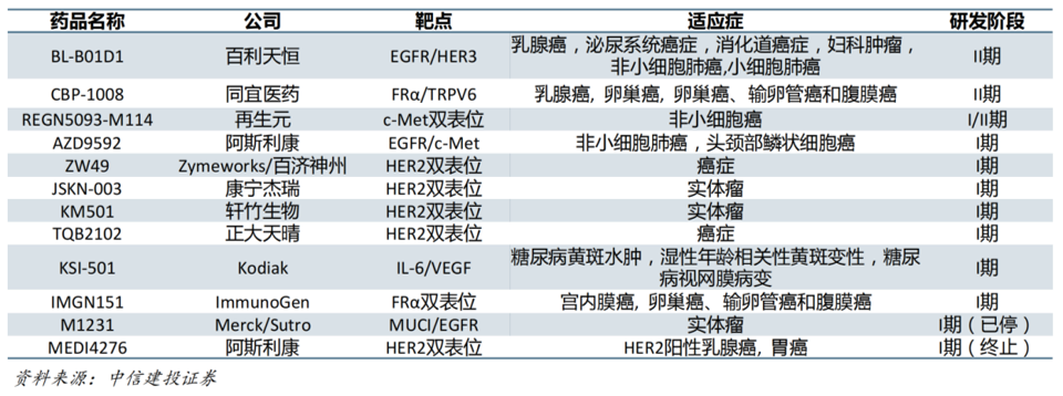 截至目前,全球范圍內(nèi)共有15款A(yù)DC藥物獲批上市,均為單抗ADC。雙抗ADC尚處于發(fā)展階段,臨床的在研產(chǎn)品數(shù)量比較有限。據(jù)統(tǒng)計,目前處于臨床階段的雙抗ADC項目有近10項,國內(nèi)國外各占50%左右(表1)。其中百利天恒的BL-B01D1(EGFR/HER3 ADC)臨床進(jìn)展領(lǐng)先(II期),展現(xiàn)出優(yōu)異的臨床治療潛力,并于近期與BMS達(dá)成獨家許可與合作協(xié)議,成為首款成功出海的雙抗ADC藥物,項目交易首付款8億美元,潛在交易總額84億美元,刷新了我國創(chuàng)新藥出海的記錄。此外,國內(nèi)其他廠商也積極布局雙抗ADC,開發(fā)相應(yīng)的技術(shù)平臺,如康寧杰瑞的糖定點偶聯(lián)平臺、百奧賽圖的RenLite全人抗體小鼠平臺和康源久遠(yuǎn)的聚乙二醇雙抗ADC平臺(P-BsADC)等。雙抗ADC的研發(fā)正形成國內(nèi)國外雙頭并進(jìn)、百花齊放的格局,未來將有越來越多的雙抗ADC藥物走進(jìn)臨床、申請上市,為病患帶來曙光。