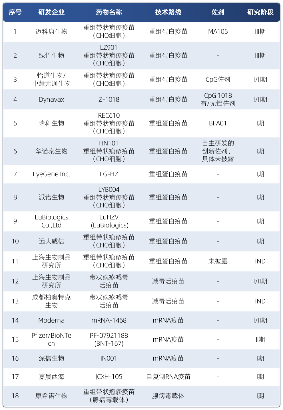 目前國(guó)內(nèi)外有多個(gè)在研的帶狀皰疹疫苗管線,技術(shù)路線包括重組蛋白疫苗、減毒活疫苗、mRNA疫苗和腺病毒載體疫苗。在采用重組蛋白技術(shù)路徑的在研疫苗中,邁科康生物和綠竹生物的重組帶狀皰疹疫苗進(jìn)展最快,處于關(guān)鍵性III期階段。在研的減毒活疫苗中,上海生物制品研究所的產(chǎn)品正處于I/II期臨床階段。Moderna和BioNTech的mRNA帶狀皰疹疫苗均處于II期臨床,深信生物的mRNA疫苗于2023年9月在美國(guó)獲批IND,2024年7月在中國(guó)獲批IND。嘉晨西海的自復(fù)制RNA(srRNA)帶狀皰疹疫苗JCXH-105在美國(guó)正處于II期臨床試驗(yàn)??迪VZ的帶狀皰疹疫苗采用的是腺病毒載體技術(shù)路徑,目前已在加拿大啟動(dòng)I期臨床研究。