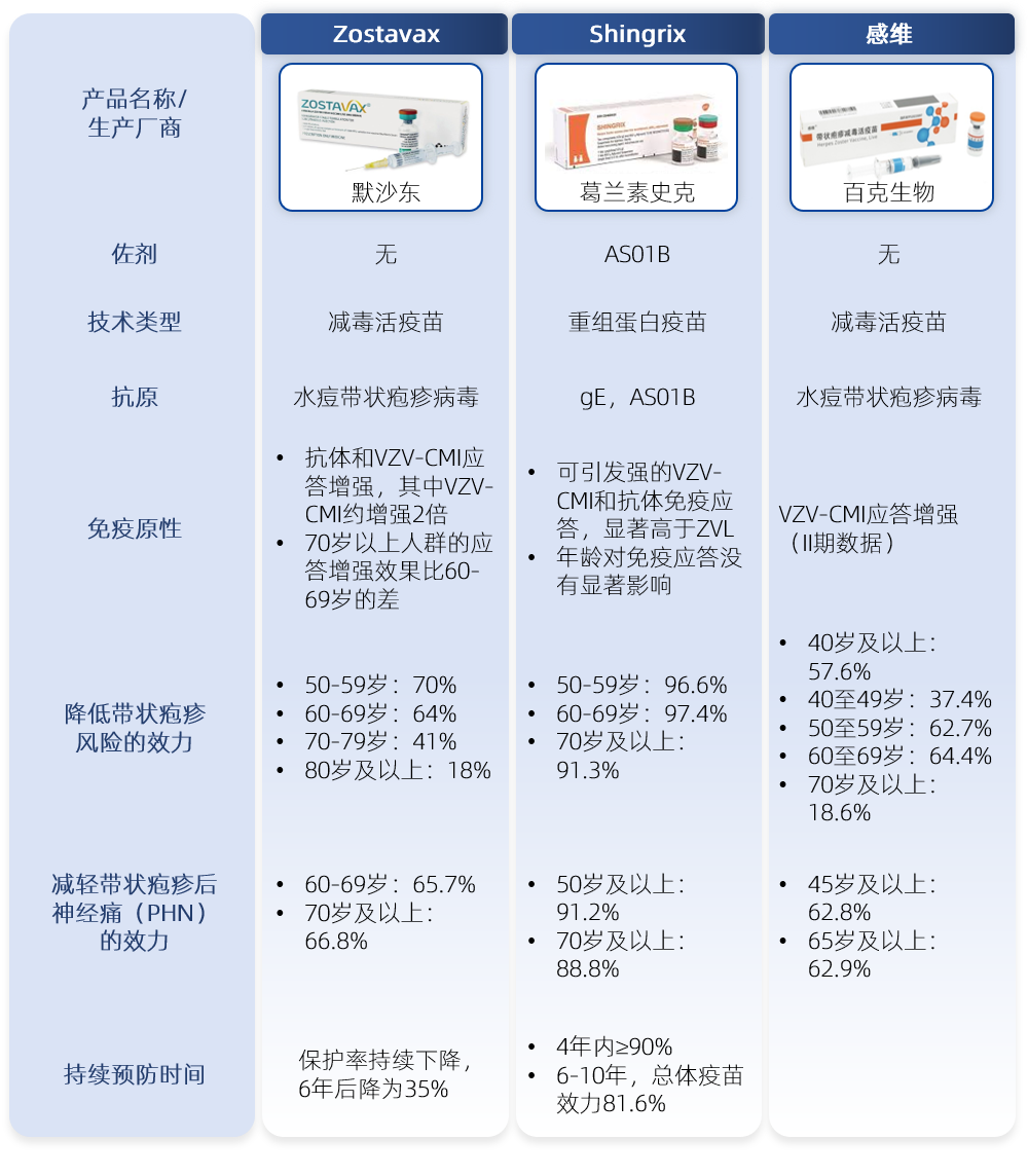 接種帶狀皰疹疫苗是預(yù)防帶狀皰疹的有效措施,目的是抑制VZV再激活從而預(yù)防帶狀皰疹、PHN和其他并發(fā)癥。目前,全球共有4個(gè)帶狀皰疹疫苗獲批上市,分別是Zostavax(默沙東),Shingrix(GSK),SkyZoster(SK Chemicals)和感維(百克生物)。其中,Shingrix和感維已在國(guó)內(nèi)獲批上市。