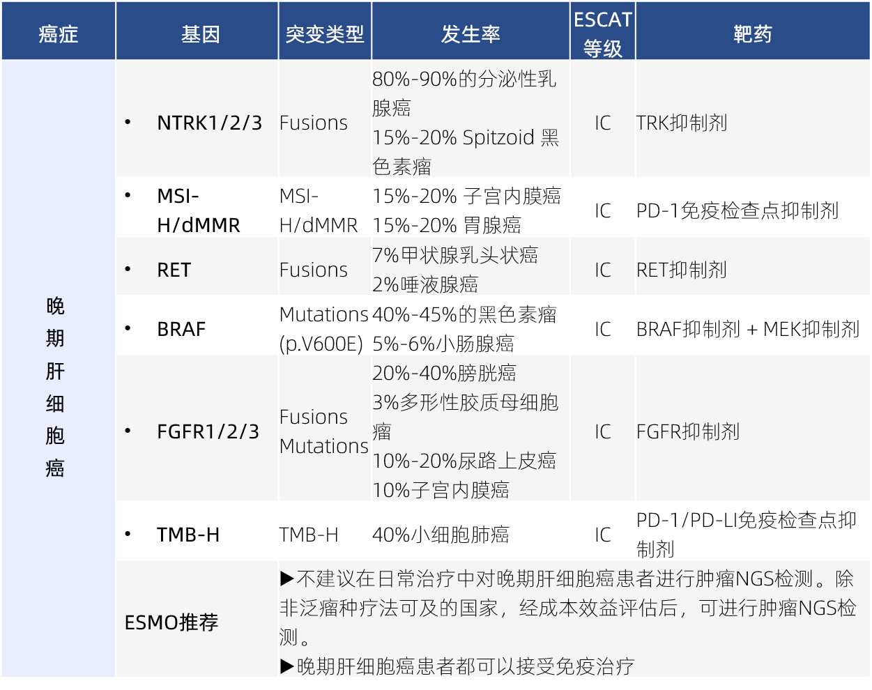 ESMO 2024 NGS指南共提及34個(gè)ESCAT I/II 類核心基因,還將MSI,HRD,TMB和dMMR等泛瘤種生物標(biāo)志物作為某些癌種的靶向標(biāo)志物。在一些癌種的NGS檢測(cè)中,指南強(qiáng)調(diào)需關(guān)注融合基因的檢測(cè)。此外,與2020年的推薦一樣,ESMO建議臨床研究中心為轉(zhuǎn)移性癌癥患者進(jìn)行多基因測(cè)序,以加速臨床研究。