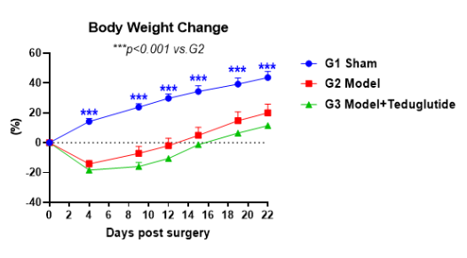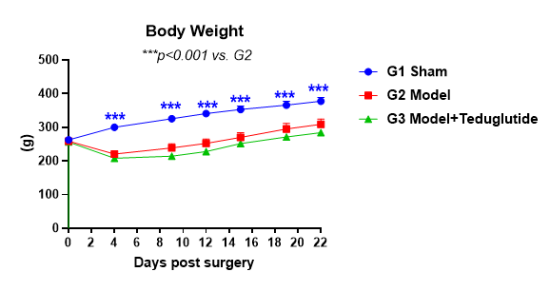 SBS術后,G2 Model組和G3 Model+Teduglutide組體重快速下降后緩慢恢復,整個實驗期間均顯著低于G1 Sham組。