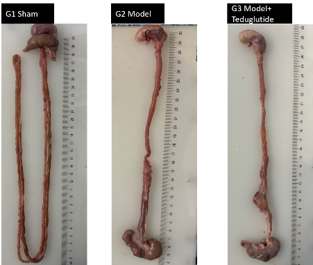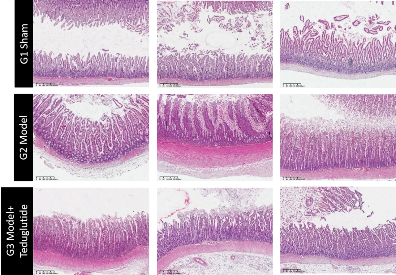 選取8周齡的雄性Sprague-Dawley大鼠切除中段小腸 75%,空回腸進行腸吻合,成功構建SBS模型,并皮下注射Teduglutide來測試對SBS的治療效果。