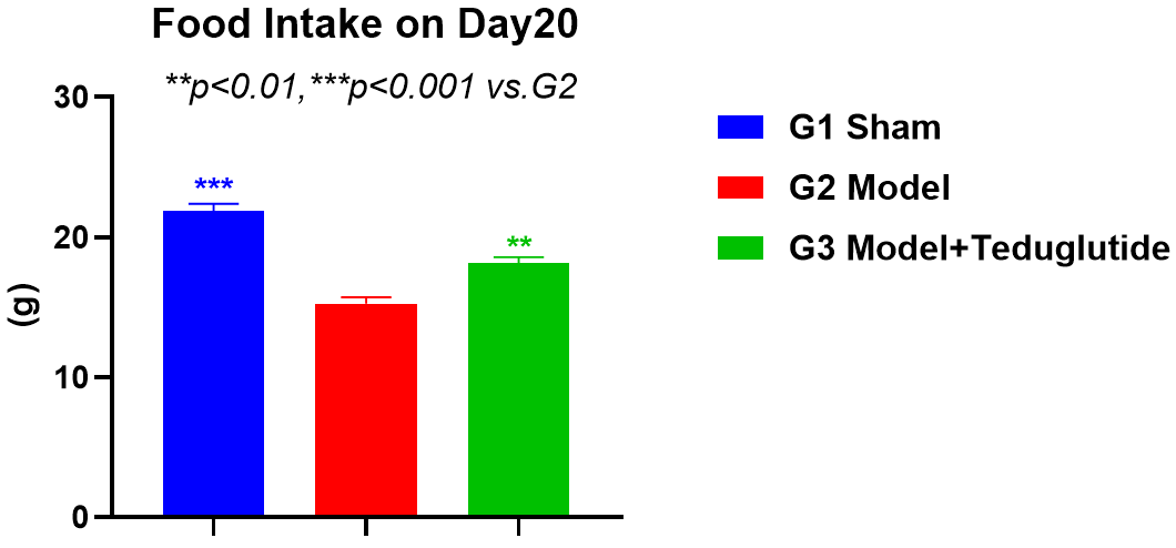 在Day20時,G2 Model組24h攝食量顯著低于G1 Sham組,G3 Model+Teduglutide組24h攝食量顯著組顯著高于G2 Model組。