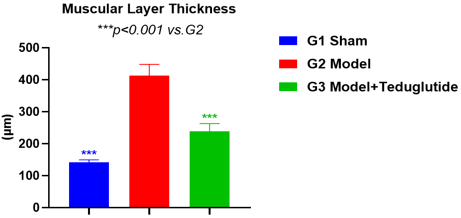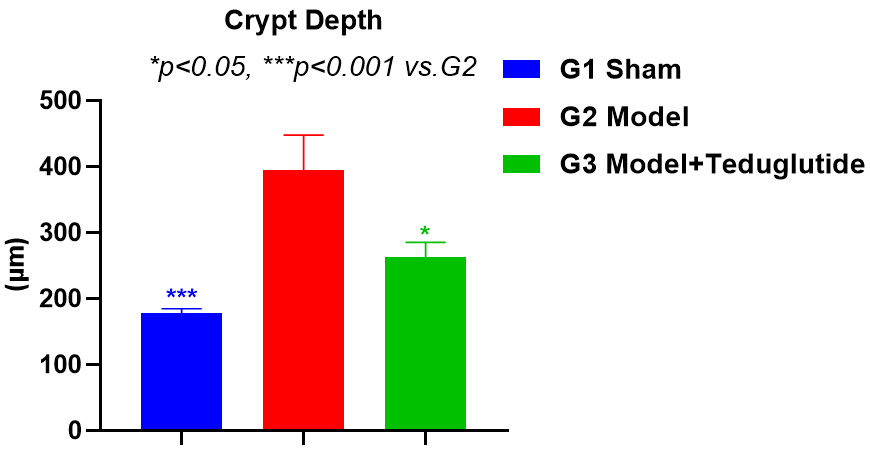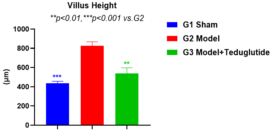 小腸HE結果顯示,G2 Model組絨毛長度、隱窩深度和肌層厚度均顯著高于G1 Sham組;G3 Model+Teduglutide組絨毛長度、隱窩深度和肌層厚度均顯著小于G2 Model組。