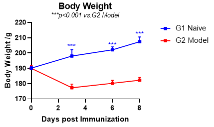 EAE模型組動(dòng)物體重在MBP免疫后顯著下降后緩慢恢復(fù),但整個(gè)實(shí)驗(yàn)期間均顯著低于空白對(duì)照組。