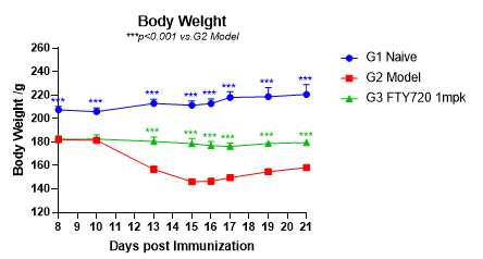 EAE模型組在MBP免疫后第8天開(kāi)始發(fā)病,依據(jù)臨床評(píng)分隨機(jī)分為模型組和芬戈莫德組,其中芬戈莫德可以顯著改善大鼠體重。