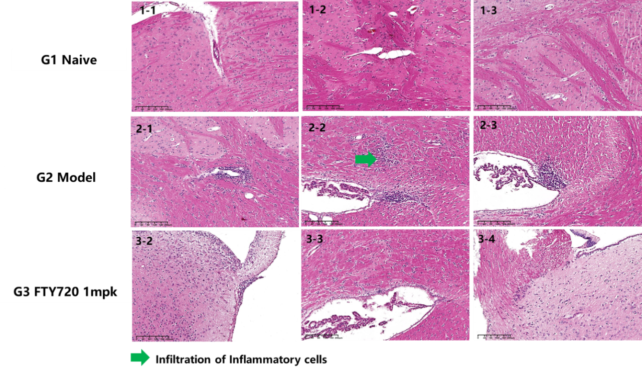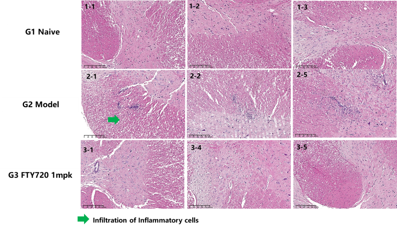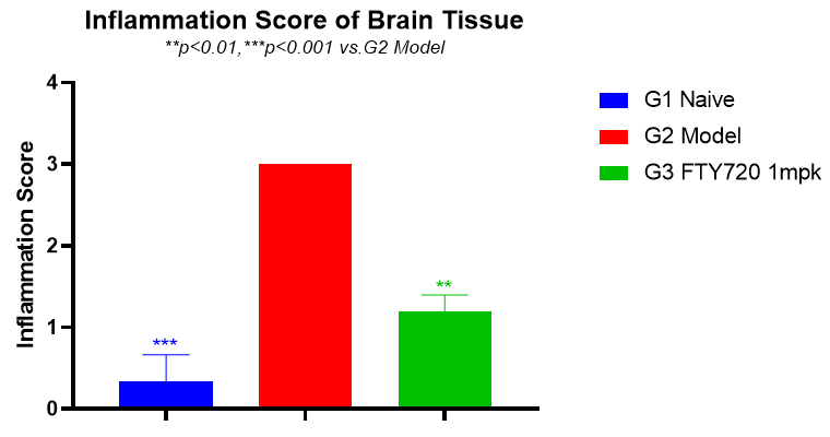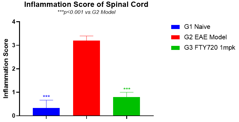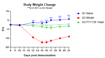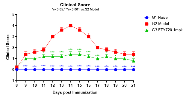 EAE模型組臨床評(píng)分逐漸升高,在第14天達(dá)到峰值。芬戈莫德可以顯著緩解癥狀,降低臨床評(píng)分。