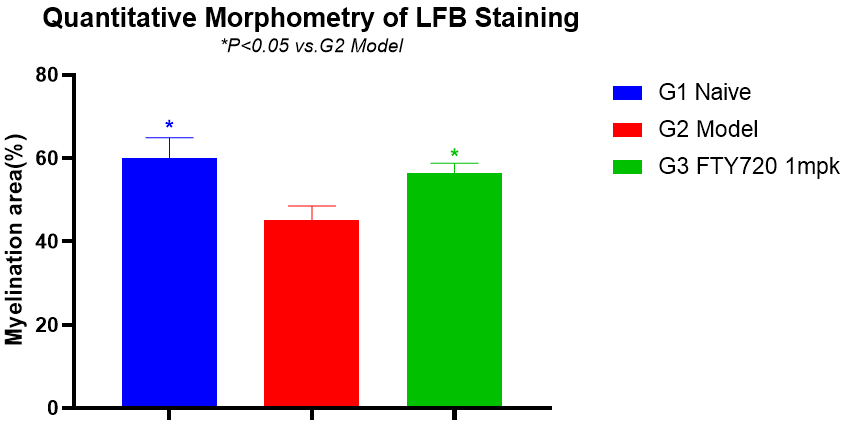 EAE模型腦組織和脊髓炎癥水平顯著升高,脊髓出現(xiàn)明顯的脫髓鞘反應(yīng)。芬戈莫德干預(yù)后可以顯著降低腦組織和脊髓炎癥水平,降低脊髓的脫髓鞘反應(yīng)。