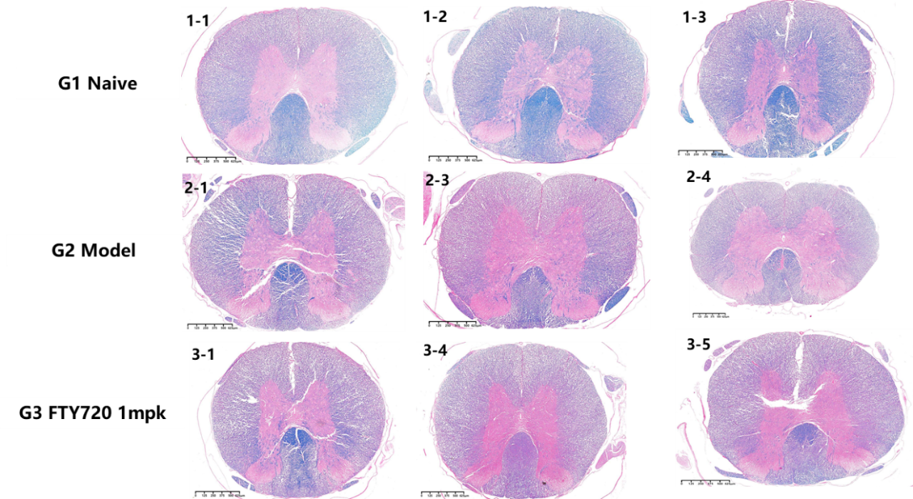 脊髓HE結(jié)果顯示,模型組炎癥評(píng)分顯著高于空白對(duì)照組,芬戈莫德可以顯著降低脊髓炎癥反應(yīng)。