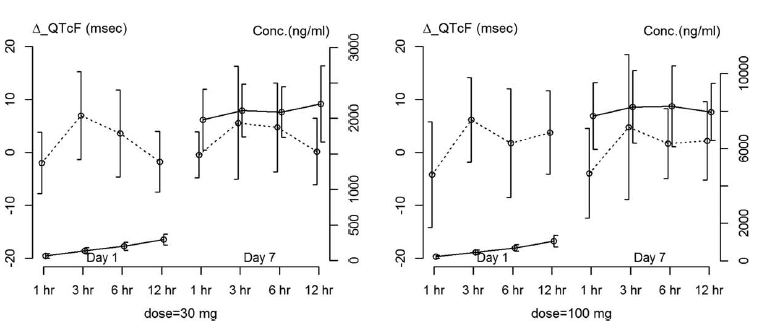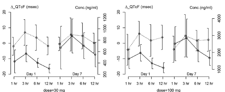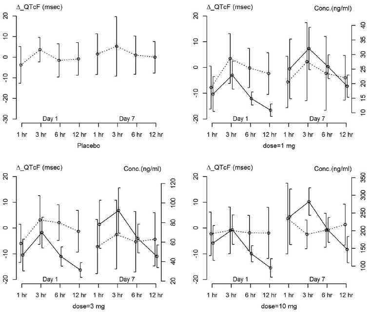 圖3 ?QTcF值(虛線)和代謝物A濃度(實線)在每個劑量水平下隨時間和按天繪制