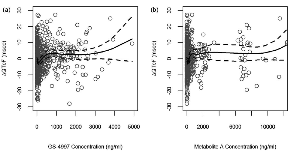 此外,估計的斜率(90%CI來自bootstrap)不顯著,90%CI的下限小于0,GS-4997為(0.0009 (-0.0007,0.0024)ms /ng/mL,代謝物A為0.0002 (-0.0004,0.0007)ms / ng/mL)。預測的中位數(shù)??QTcF和90% CI的GS-4997和代謝物A濃度的評估如圖4所示。