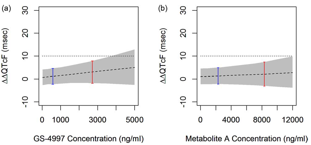 注:水平虛線表示10ms的參考線。虛線表示各濃度下??QTcF預測的中位數(shù)?;疑幱皡^(qū)域表示預測??QTcF的90%CI。藍色內(nèi)部是GS-4997和代謝物A治療濃度下的90%CI,紅色區(qū)間是GS-4997和代謝物A超治療濃度下的90%CI