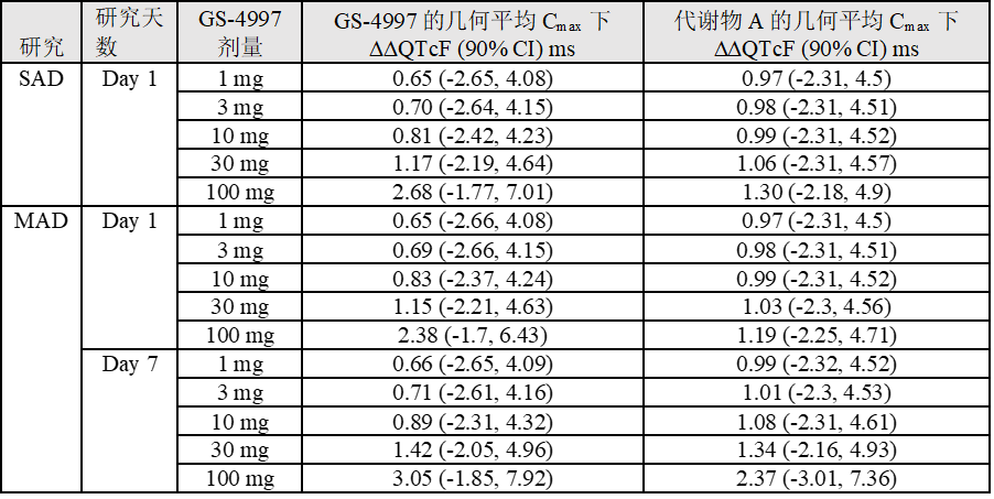 表3 GS-4997和代謝物A的幾何平均Cmax下ΔΔQTcF的點估計和雙側(cè)90% CI
