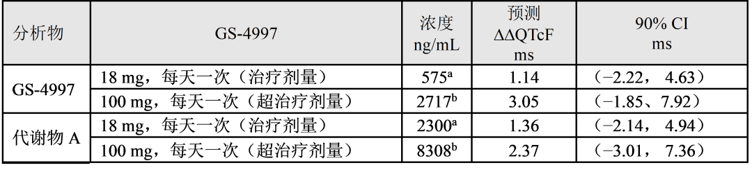 表2 GS-4997 和代謝物 A峰濃度下??QTcF的預測值及雙側(cè) 90%CI