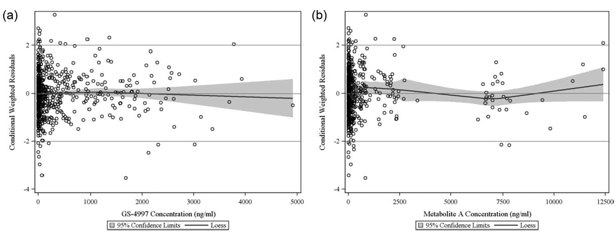 構(gòu)建了帶有局部加權(quán)散點圖平滑 (LOESS) 趨勢線的條件加權(quán)殘差 (CWRES)濃度圖,以評估GS-4997和代謝物A模型的擬合優(yōu)度。GS-4997濃度與CWRES的關(guān)系用 LOESS趨勢線繪制(圖 5A)。大多數(shù)CWRES在平均 CWRES的兩個標準差 (SD) 范圍內(nèi)(即零),并且 LOESS線沒有顯示系統(tǒng)趨勢,表明模型擬合良好。同樣,繪制了CWRES與代謝物A濃度的關(guān)系圖,表明模型擬合良好。