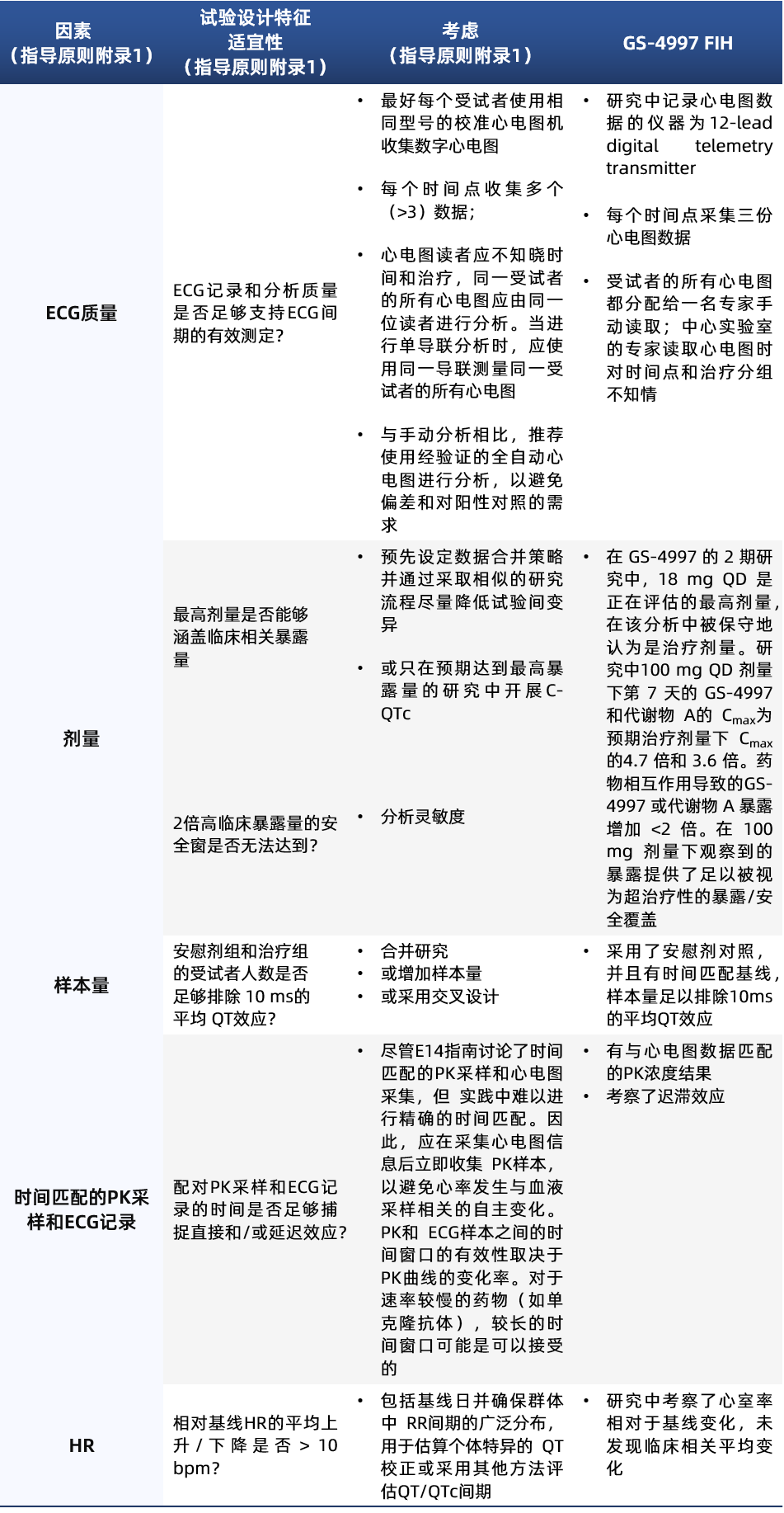 針對以上指導原則中提到的豁免條件,GS-4997 FIH研究均滿足,關(guān)于劑量、研究設(shè)計、方案實施、數(shù)據(jù)采集等方面已在表4進行了匯總,對于混合效應(yīng)模型的前提在該研究中也進行了探索性分析,包括血藥濃度與?QTcF的遲滯效應(yīng)考察、血藥濃度與ΔQTc的線性關(guān)系考察,并且該研究結(jié)果為陰性,綜上所述,F(xiàn)DA及EMA豁免了該藥物的TQT研究。